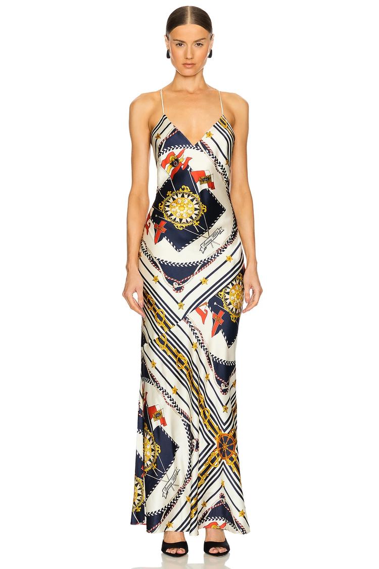 Soft satin fabric drapes effortlessly in this elegant slip dress featuring a sleek maxi length and a slim fit that flatters the silhouette. The V-neckline and delicate spaghetti straps enhance its modern sophistication, while the striking abstract print in black, gold, and red adds vibrant visual interest. Perfect for spring and summer occasions, this dress suits brunches, date nights, and night outs with its versatile yet refined appeal. The strappy back design and clean hemline complete the look, making it a standout choice for warm-weather events.
