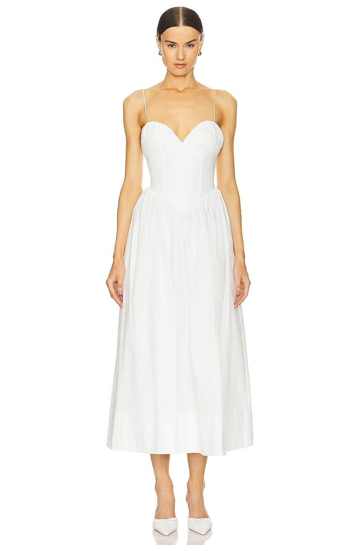 Soft white cotton poplin shapes a classic A-Line midi dress with a fitted bodice and a flattering sweetheart neckline. The strapless silhouette is complemented by a hidden side zipper closure and side seam pockets for effortless style and practicality. Its clean hemline and lightweight feel make it ideal for spring and summer occasions such as brunch, date nights, or wedding guest events. This minimalist yet elegant dress offers breathable comfort with a timeless appeal, perfect for elevating your warm-weather wardrobe with understated sophistication.