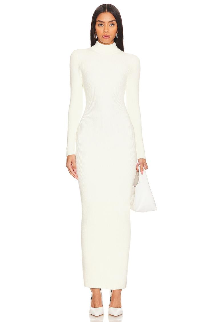 A sleek silhouette with a high neckline and long sleeves defines this elegant white sheath dress crafted from soft bouclé knit fabric. Its fitted design flows to a clean maxi hem, offering a sophisticated and minimalist look ideal for cocktail parties, date nights, or evening outings in cooler seasons. The pull-on style ensures comfort alongside style, making it a refined choice for those seeking understated luxury and versatility in their wardrobe.