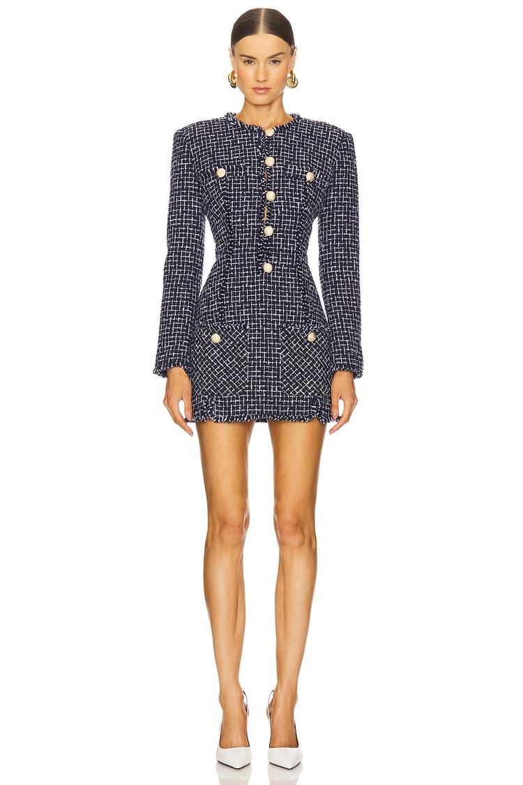 Structured with padded shoulders and a fitted silhouette, this mini blazer dress showcases a classic navy and white checkered pattern all over. Featuring a round neckline and long sleeves, the dress is finished with clean hemlines and elegant front button details that add sophistication. Crafted from a wool and polyester blend with viscose lining, it offers warmth and comfort ideal for autumn and winter occasions. Perfect for business casual settings, cocktail parties, or night outs, its concealed back zipper and front buttoned pockets provide practicality alongside style.