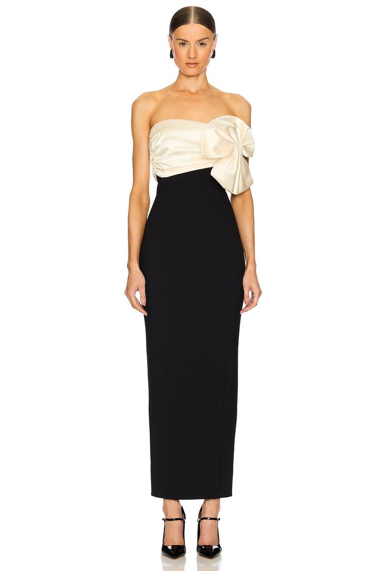 Soft satin and crepe fabrics combine in this elegant column silhouette maxi dress, featuring a fitted bodice and a striking off-white bow detail at the straight strapless neckline. The concealed back zipper and back vent add functional elegance, making it ideal for cocktail parties, formal events, or romantic date nights. Its sleek black base colour contrasts beautifully with the satin bow, creating a sophisticated and timeless look. This dress promises graceful movement and lasting comfort for all-weather wear.