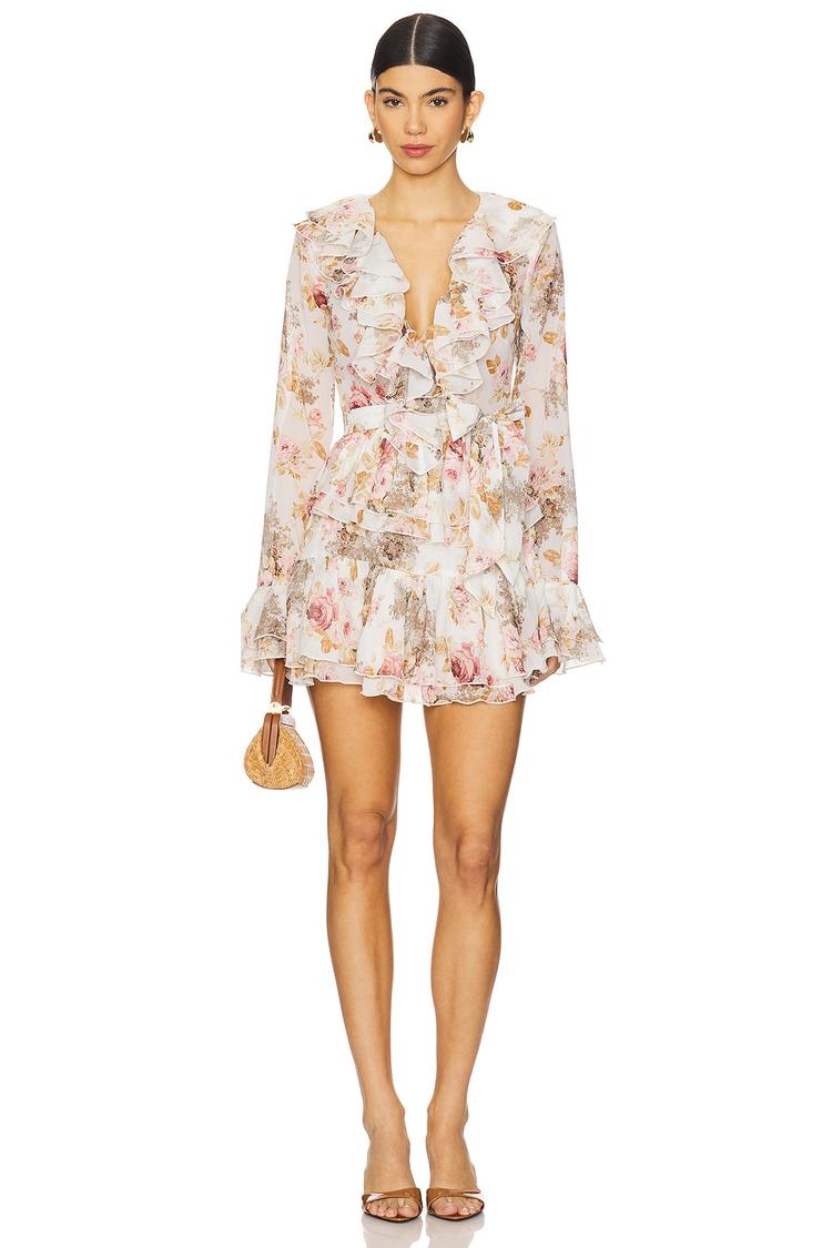 Soft chiffon layered in a mini-length shift silhouette, this floral Palermo dress offers a relaxed fit that flatters with its long sleeves and V-neckline. Romantic ruffles grace the front, hem, and sleeves, adding delicate texture, while a detachable tie belt defines the waist. Perfect for spring and summer occasions, it suits brunches, date nights, and cocktail events with ease. Crafted from midweight polyester chiffon, this elegant and feminine piece balances airy softness with structured padded shoulders for a polished look.