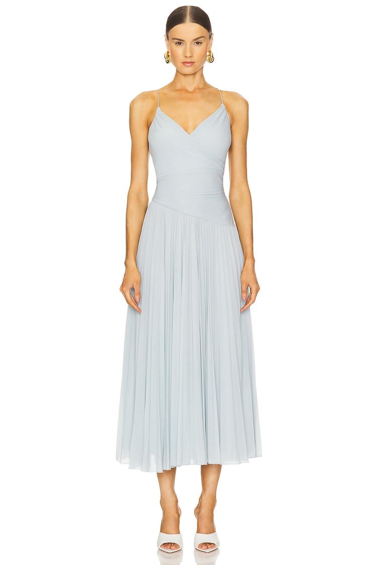 Soft pleated fabric and a fitted bodice sculpt a graceful fit and flare silhouette in this light blue midi dress. The V-neckline and slender spaghetti straps highlight the shoulders, while the concealed side zipper with hook closure ensures a sleek back design. Crafted from a polyester-spandex blend, it offers a comfortable stretch and elegant drape, fully lined for smooth wear. Ideal for spring and summer, this classic and sophisticated dress suits cocktail parties, semi-formal events, and romantic date nights with effortless style.