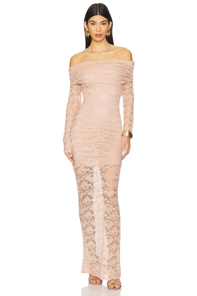 Delicate lace fabric envelops a figure-hugging sheath silhouette in this elegant maxi dress, featuring a flattering off-shoulder neckline with foldover detail and long sleeves. The concealed side zipper ensures a smooth fit, while the soft blush tone adds a romantic, sophisticated touch. Ideal for cocktail parties, date nights, or upscale evening events, this dress combines sexy appeal with timeless elegance. The partial lining enhances comfort without sacrificing the sheer allure of lace, making it perfect for spring through autumn wear.