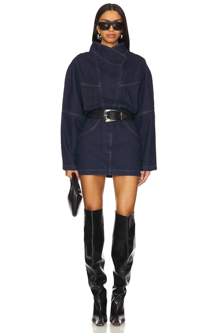 A heavyweight denim shirt dress in a rich dark blue hue offers a versatile mini length perfect for layering or standalone wear. Featuring a stand collar, long regular sleeves, and a front fly zipper with snap closure, it balances functionality with style. The optional belted waist enhances the regular fit silhouette, while side seam pockets add practicality. This casual chic piece transitions seamlessly from casual daytime outings and streetwear to brunch or evening date nights, offering comfort and modern minimalism crafted from cotton and polyester blend fabric.