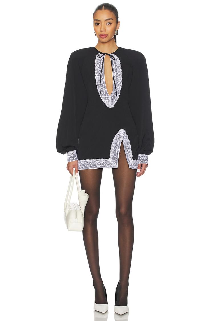 Lightweight matte black crepe fabric shapes this elegant mini shift dress featuring long balloon sleeves and a striking keyhole neckline. White lace trim accents the collar, cuffs, and hem, adding sophisticated contrast and delicate detail to the silhouette. A concealed back zipper with hook-and-eye closure ensures a seamless fit. Ideal for cocktail parties, date nights, and stylish evenings out, this Italian-made piece blends classic sophistication with modern allure for versatile wear across seasons.