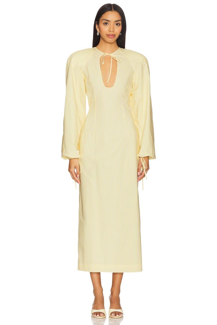 Soft matte cream cotton poplin defines this column maxi dress with a sophisticated fitted silhouette and long puffed sleeves. The keyhole neckline with a tie closure adds a subtle focal point, balanced by padded shoulders and tie cuffs that bring refined structure. A back vent enhances ease of movement while the fully lined midweight fabric ensures comfort and polish. Ideal for cocktail events, semi-formal gatherings, or elegant date nights, this classic and elegant design embodies understated sophistication for spring, summer, or autumn wardrobes.