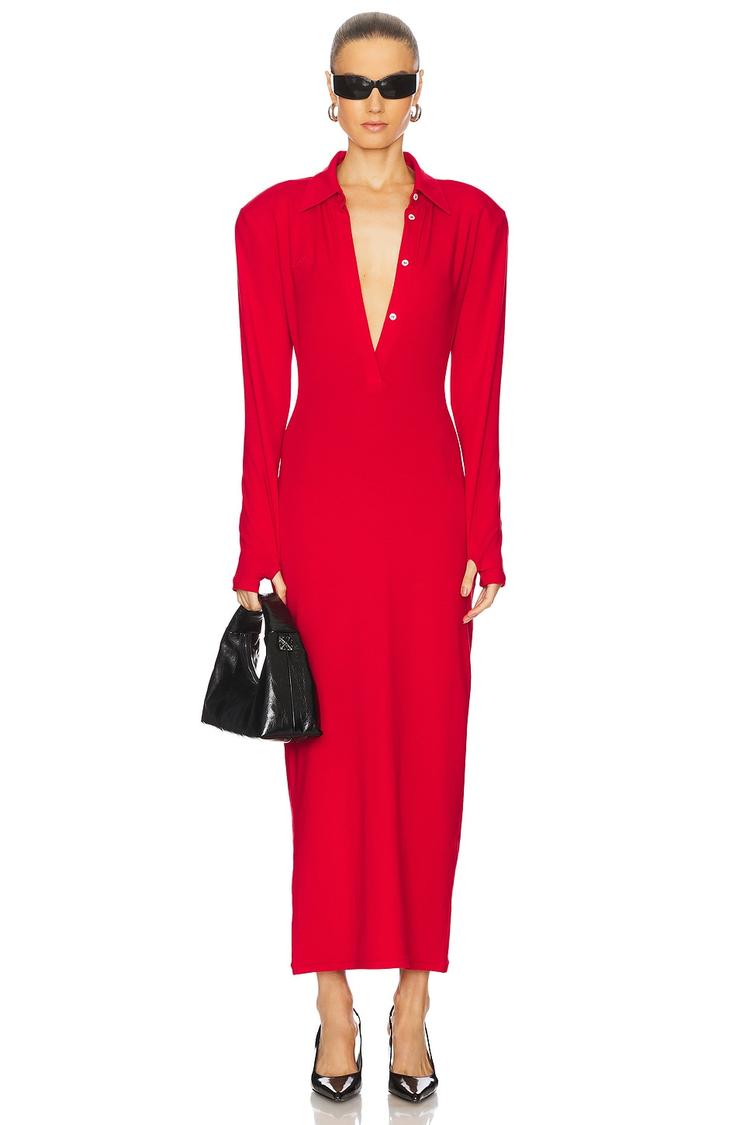 A sleek red midi dress crafted from stretchy cotton jersey combines classic polo collar styling with a fitted silhouette. The long sleeves feature functional thumbholes, while padded shoulders add structured sophistication. A partial front button closure enhances versatility, and a back vent allows comfortable movement. This minimalist sheath dress is ideal for business casual settings, workwear, or a polished date night look during cooler seasons.