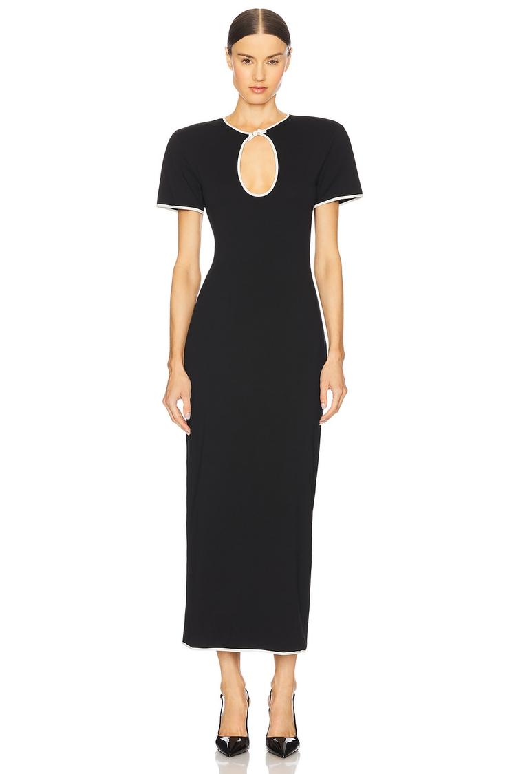 Sleek and modern, this matte black sheath maxi dress features a flattering fitted silhouette crafted from a comfortable cotton-elastane jersey blend. The standout keyhole neckline and structured padded shoulders add a touch of sophistication, while the back slit ensures ease of movement. Ideal for cocktail parties, date nights, or stylish evening outings, its minimalist design and clean hemline make it a versatile and elegant choice across seasons.