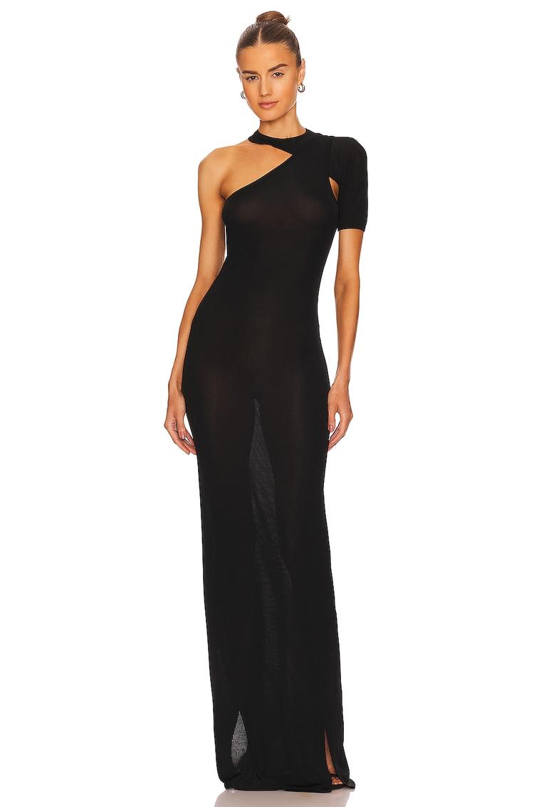 Semi-sheer ribbed fabric and a sleek column silhouette define this sophisticated maxi dress with an asymmetric neckline and a striking one-shoulder cut-out. The bodycon fit embraces the figure, complemented by half sleeves and a slit hem for graceful movement. Perfect for cocktail parties, formal evenings, or a night out, its pull-on styling and lightweight acetate blend offer comfort and elegance. This modern, sexy piece stands out with clean lines and subtle details, making it a versatile choice for elevated occasions.