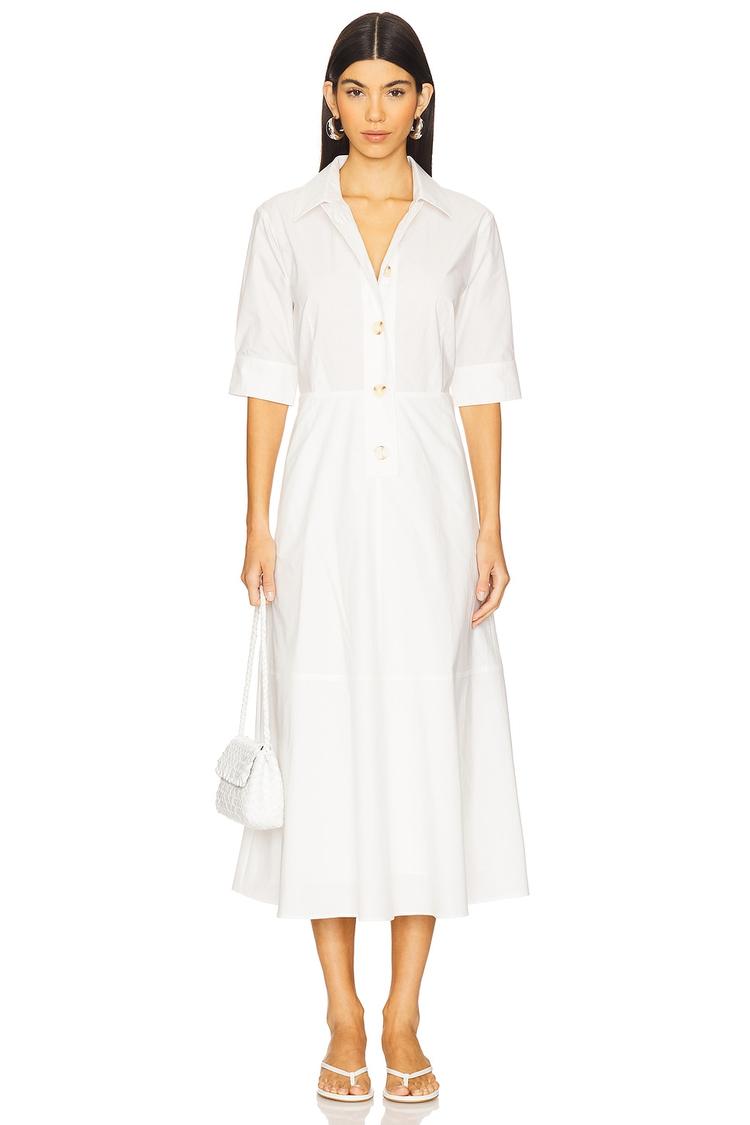 Crisp cotton poplin lends a classic, clean look to this midi-length shirt dress, tailored with a collared neckline and half sleeves with button cuffs. The regular fit and front button closure ensure easy wear, while side seam pockets add practical charm. Partially lined at the skirt for added structure, this minimalist white dress transitions effortlessly from workwear to casual brunches and springtime outings.
