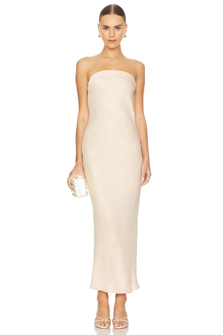 A sleek cream slip dress crafted from a smooth satin fabric overlay with a viscose-rayon blend lining offers a slim, figure-flattering silhouette. The strapless design features a straight neckline and a hidden side zipper closure, flowing gracefully to a clean maxi hem. Perfect for spring and summer, its minimalist elegance suits cocktail parties, formal events, or romantic date nights with ease. Fully lined for comfort and sophistication, this dress blends classic refinement with modern simplicity for versatile upscale occasions.