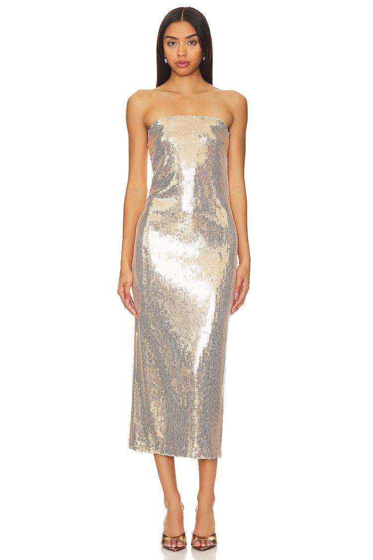 Shimmering with all-over sequins, this metallic silver column dress offers a sleek, fitted silhouette that flatters every curve. The strapless straight neckline and sleeveless design enhance its modern elegance, while the midi length and back vent ensure graceful movement. Crafted from a polyester-elastane blend, it delivers a comfortable yet sophisticated fit. Perfect for cocktail parties, date nights, or glamorous evenings out, this dress embodies effortless glamour and refined style.