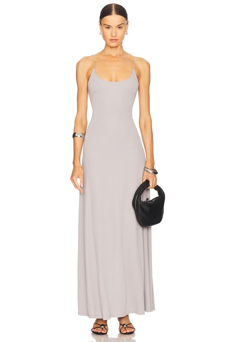A sleek, matte light gray slip dress crafted from midweight crepe fabric blends polyester and viscose for a smooth, figure-hugging fit. Its maxi length cascades elegantly with a clean hemline, complemented by adjustable spaghetti straps and a distinctive open back with a hook closure. The straight neckline enhances its minimalist, modern style, perfect for spring through autumn. This versatile dress shines for date nights, cocktails, and stylish brunches, embodying effortless sophistication and contemporary elegance.