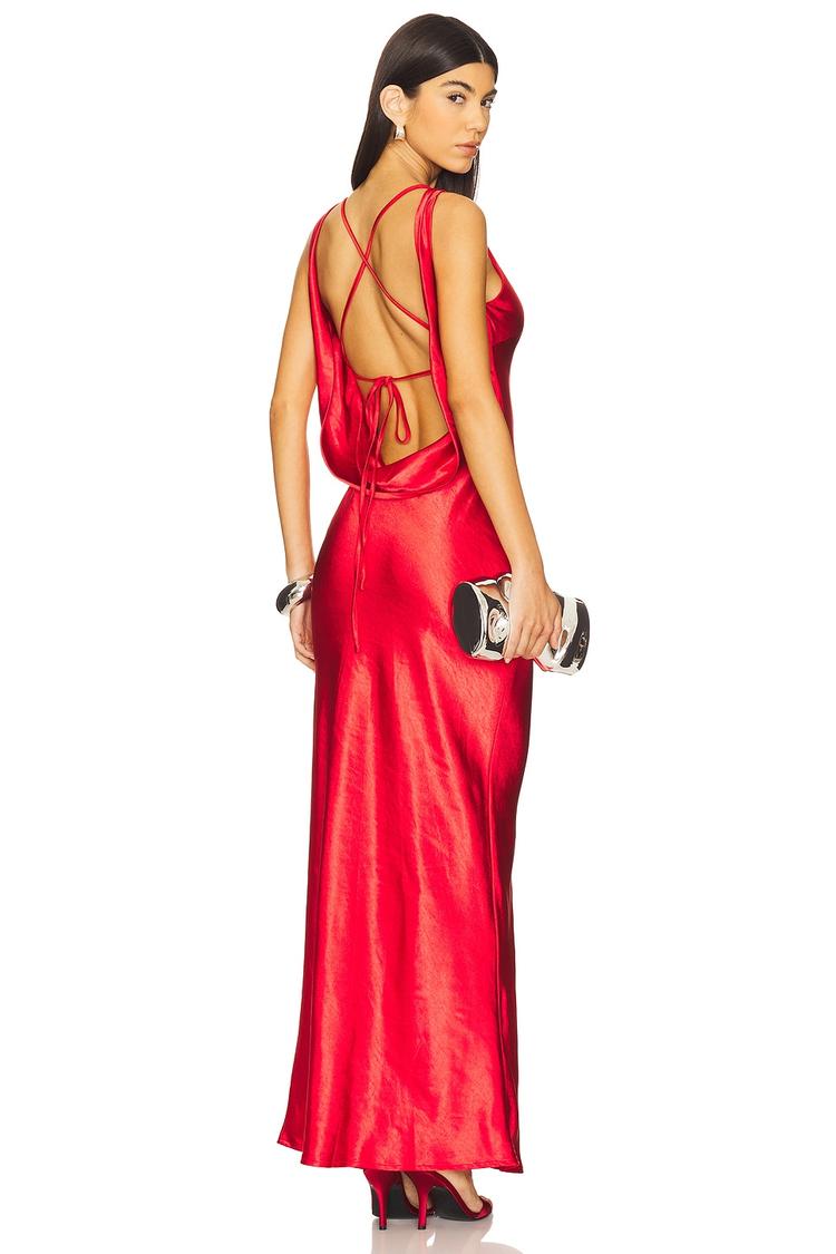 Sleek satin in a striking red hue sculpts a fitted maxi slip dress that radiates minimalist elegance. The straight neckline and sleeveless straps complement the sensual draped open back with a lace-up tie closure, adding a captivating detail. Crafted from midweight polyester with elastane for stretch, this dress flows smoothly to a clean hemline, perfect for cocktail events, semi-formal occasions, or romantic date nights. Its timeless silhouette and luxurious fabric make it a standout piece for any refined wardrobe.