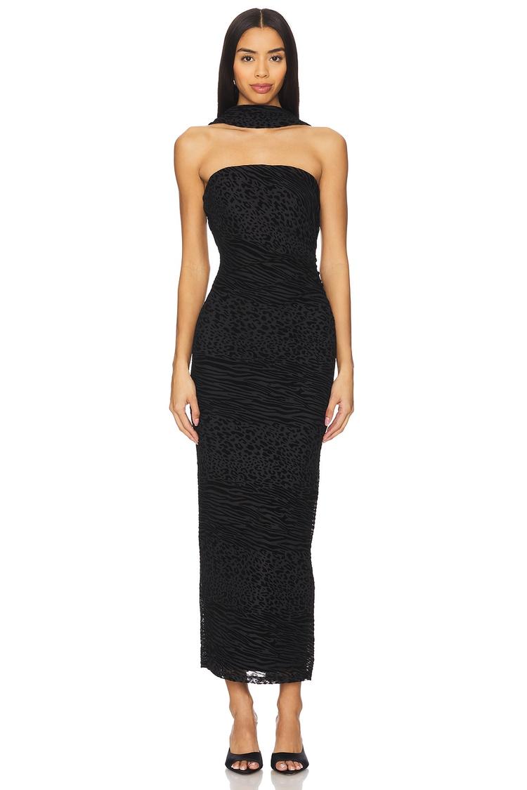 A sleek column silhouette in matte black jersey fabric offers a fitted and flattering shape perfect for cocktail evenings and date nights. The straight, strapless neckline accentuates the shoulders, while the open back with a subtle strap closure adds a daring touch of elegance. Lightweight and comfortable with a concealed back zipper, this midi dress blends modern sophistication with sexy appeal, making it ideal for night outs or upscale events.
