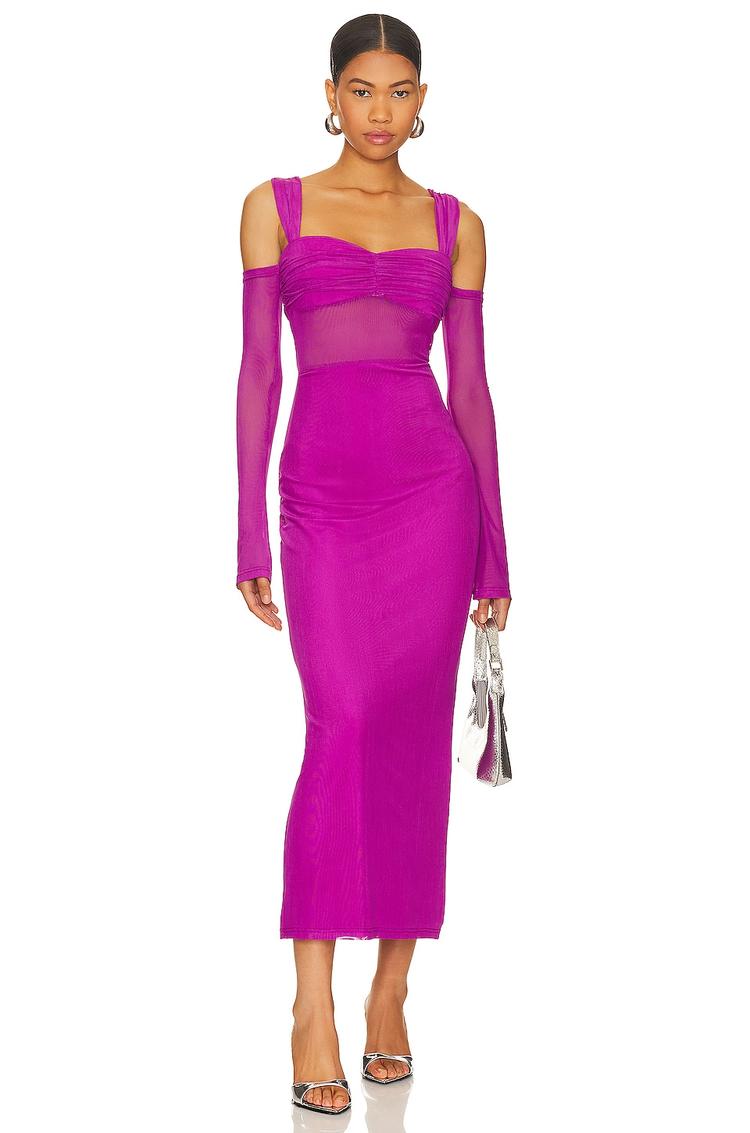 A vivid bright fuchsia sheath dress with a sleek midi length and a fitted silhouette makes a bold statement. The straight neckline and sleeveless design emphasize modern sexiness, while the ruched bust adds elegant texture to the bodice. Crafted from a comfortable blend of polyester and elastane, this dress features a concealed back zipper and attached sheer sleeves that enhance its contemporary appeal. Ideal for cocktail evenings, date nights, or a night out, this fully lined dress offers sophistication and style for versatile occasions.