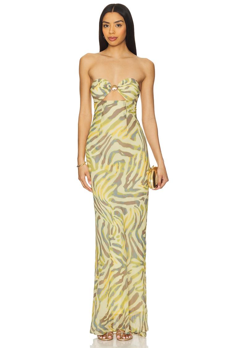 Soft chiffon in a matte beige and olive abstract pattern shapes a fitted column silhouette with a straight strapless neckline and sleeveless style. The maxi length flows elegantly to a clean hemline, enhanced by a front gold-toned seashell applique detail and a hidden back zipper for a seamless finish. Lightweight and fully lined, this dress offers comfort and sophistication for cocktail parties, date nights, and upscale evening events during spring and summer seasons.