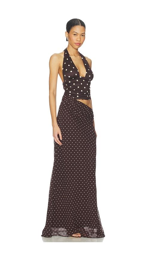 RUNAWAY THE LABEL VALERIA HALTER CUTOUT MAXI DRESS IN CHOCOLATE.