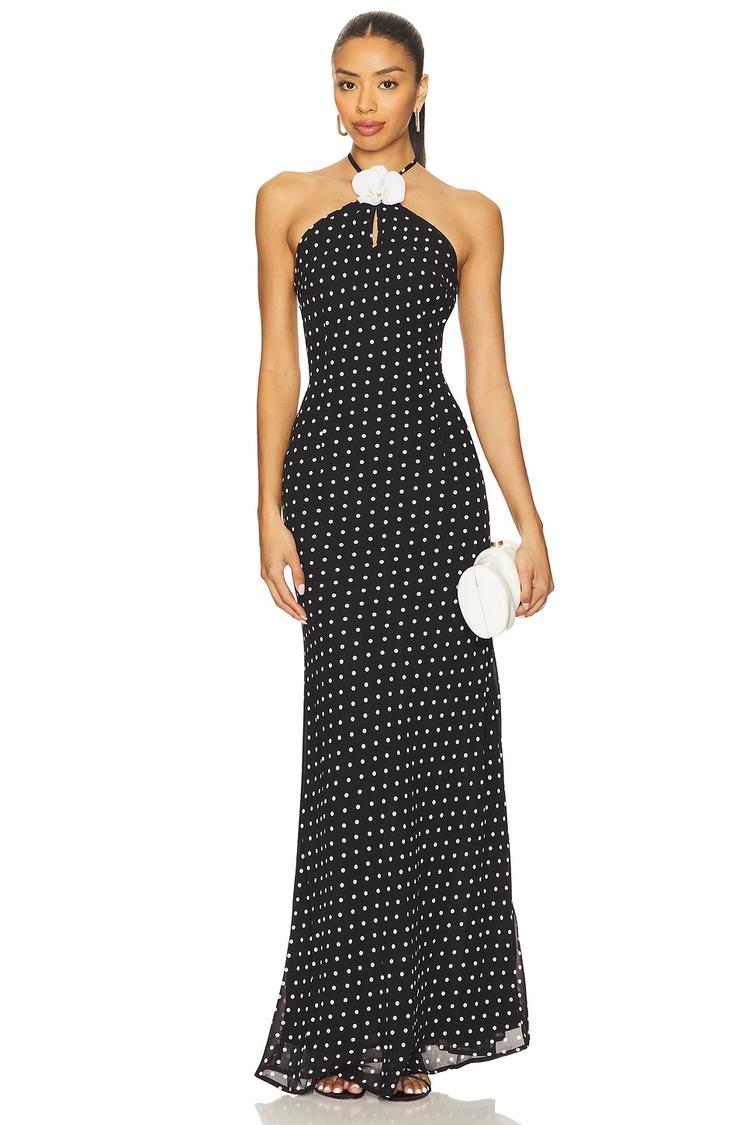 Flowing chiffon with a delicate polka dot print defines this elegant maxi column dress. Featuring a fitted silhouette, halter neck, and sleeveless styling, it flatters the figure while offering a chic open back with a tie closure. The subtle 3-D floral applique at the neckline adds a refined touch. Ideal for cocktail parties, date nights, and semi-formal events, its lightweight polyester fabric ensures comfort during spring and summer occasions.