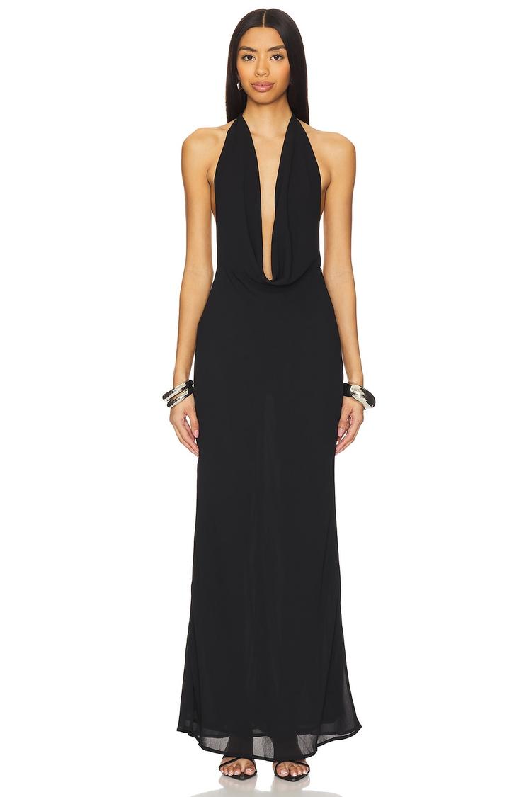 A sleek column silhouette in matte black satin creates a timeless look with a plunging neckline and sleeveless halterneck styling. The open back features an adjustable tie closure, complemented by a hidden back zipper for a smooth finish. This maxi dress offers a slim fit that gracefully skims the body, perfect for cocktail parties, date nights, and sophisticated evening outings. Crafted from midweight polyester satin, it blends elegance with a minimalist yet sexy vibe suitable for all seasons.