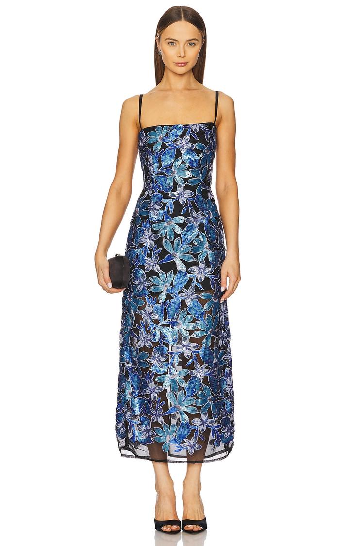 Shimmering sequin floral details adorn this elegant slip dress crafted from crepe polyester. The slim fit and straight neckline complement adjustable spaghetti straps, creating a chic silhouette that falls gracefully to a midi hemline. The concealed back zipper and covered back ensure a sleek finish, perfect for cocktail evenings, date nights, or stylish night outs. Its versatile color palette of matte dark blue with black and blue accents adds a sophisticated touch suitable for spring through autumn wear.