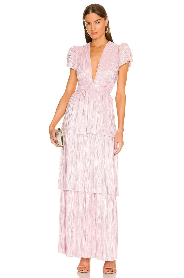 Soft shimmer and delicate pleating define this elegant maxi dress with a plunging neckline and puffed short sleeves. The layered hemline and keyhole back detail add sophisticated charm, complemented by an attached waist tie for a flattering silhouette. Crafted in polyester with lurex accents, this dress offers a regular fit that flows beautifully for spring and summer events. Ideal for cocktail parties, date nights, and formal occasions, its modern design combines graceful movement with subtle sparkle to elevate your evening wardrobe.