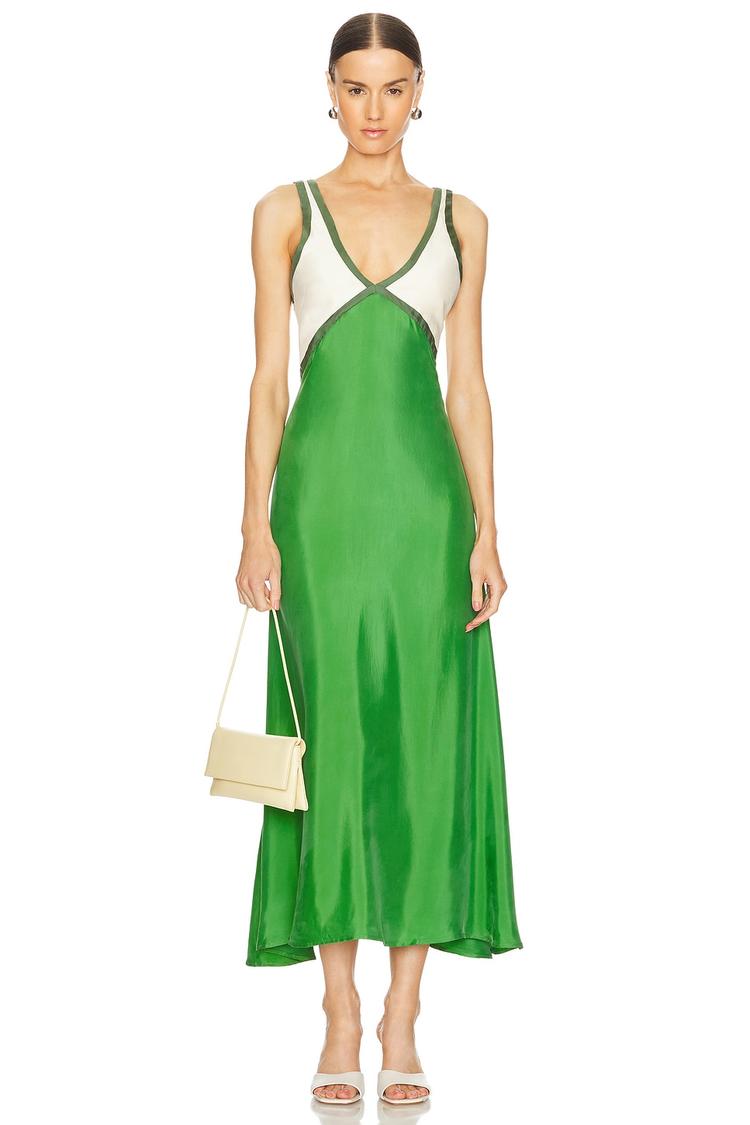 Soft cupro and viscose blend fabric shapes this elegant slip dress featuring a flowing midi-length silhouette that drapes beautifully. The deep V-neck and sleeveless design with wide straps enhance its minimalist modern appeal. A concealed side zipper ensures a smooth fit while the striking matte green base is contrasted by an ivory bodice detail, creating a chic color-block effect. Ideal for spring and summer brunches, date nights, or cocktail parties, this dress offers effortless style and comfort for versatile occasions.