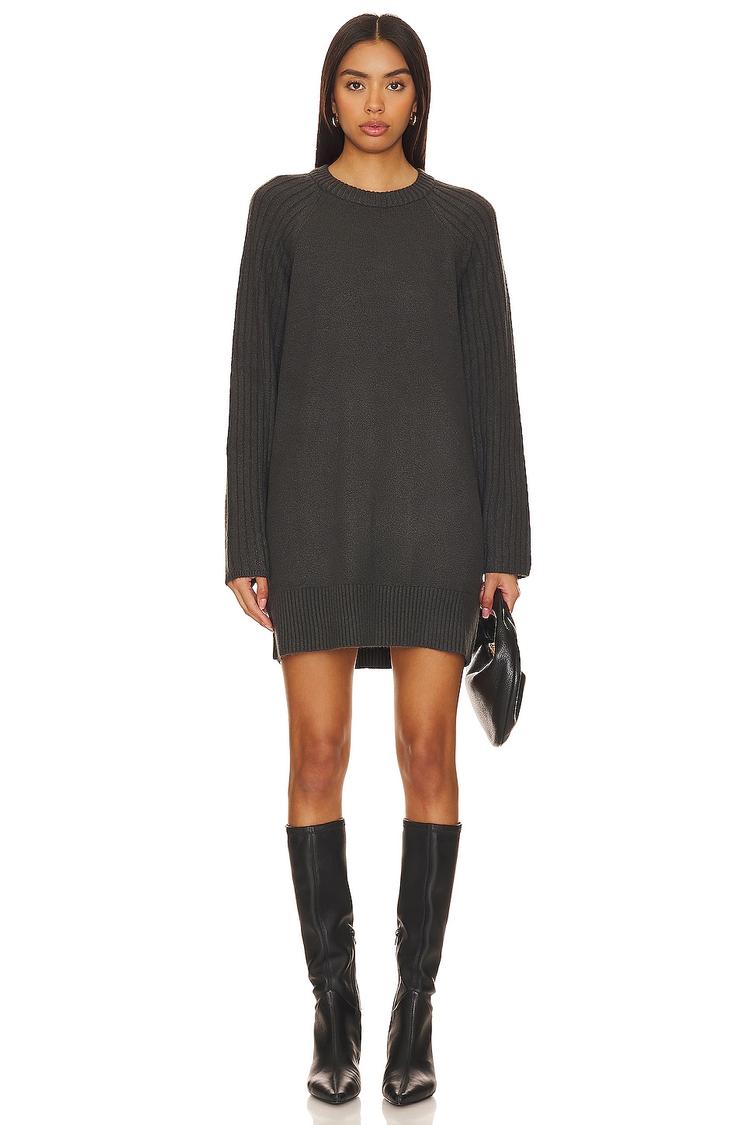 A matte black knit sweater dress features a relaxed fit and mini length, perfect for layering in cooler months. The crew neckline and long sleeves are accented with ribbed trims at the cuffs and collar, adding subtle texture to the minimalist design. This versatile pullover dress combines comfort with casual chic style, making it ideal for everyday wear, casual work environments, and weekend outings. Crafted from a soft blend of cotton, acrylic, polyester, and spandex, it provides gentle stretch and warmth, embodying effortless autumn and winter fashion.