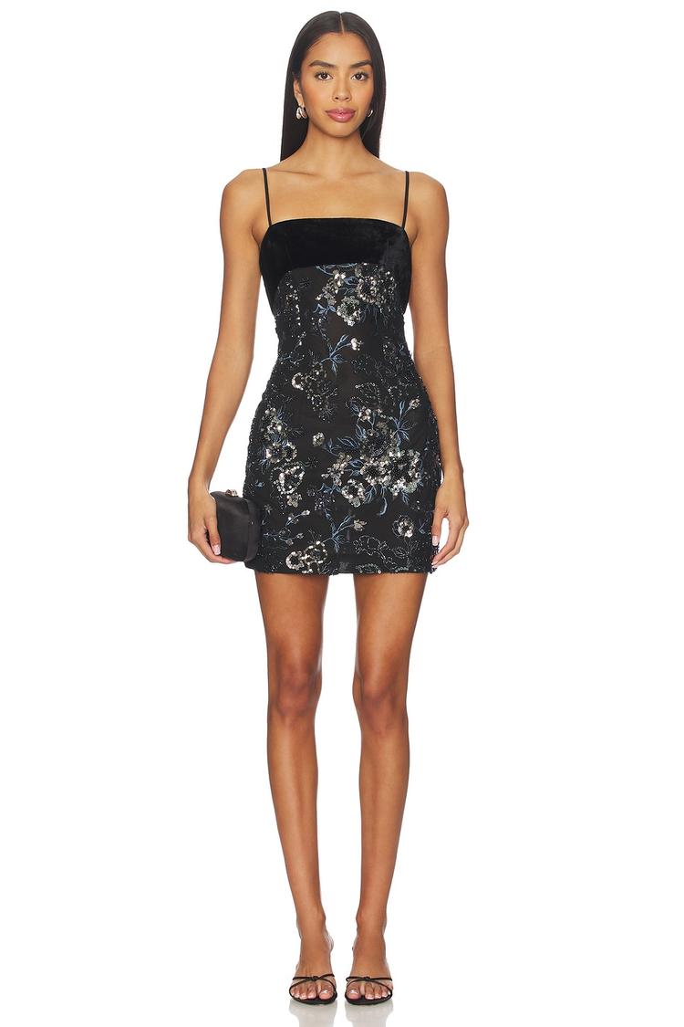 Shimmering sequins overlay a fitted black crepe slip dress, featuring delicate spaghetti straps and a straight neckline that enhances its sleek silhouette. The mini length and open back with a stylish cut-out detail create an alluring, modern look perfect for night outs, cocktail parties, or date nights. This elegant Ari Dress combines subtle texture with eye-catching embellishment, making it a standout piece for versatile evening occasions.