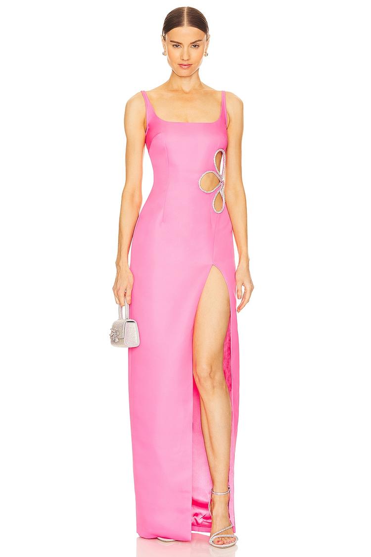 A sleek column silhouette in matte pink satin fabric highlights the slim fit and square neckline of this elegant maxi dress. The sleeveless design with wide straps and a high side slit adds a bold touch, while rhinestone-embellished floral cut-outs at the sides bring sophisticated sparkle. With an invisible back zipper and fully lined construction, this dress promises both style and comfort. Ideal for cocktail parties, formal events, or a glamorous night out, it embodies refined sophistication with a modern edge.