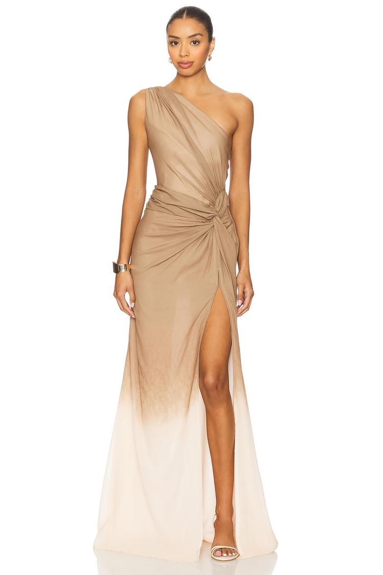 An elegant column silhouette with a graceful one-shoulder strap defines this maxi dress, featuring a sophisticated draped wrap detail at the front and a daring side slit. Crafted in midweight matte polyester georgette with a stunning ombre effect from beige to off-white, this fully lined gown offers a fitted shape that flatters. The hidden back zipper and hook and eye closure ensure a seamless finish. Ideal for cocktail parties, formal events, gala evenings, or an elegant date night, this dress radiates classic sophistication and timeless style.