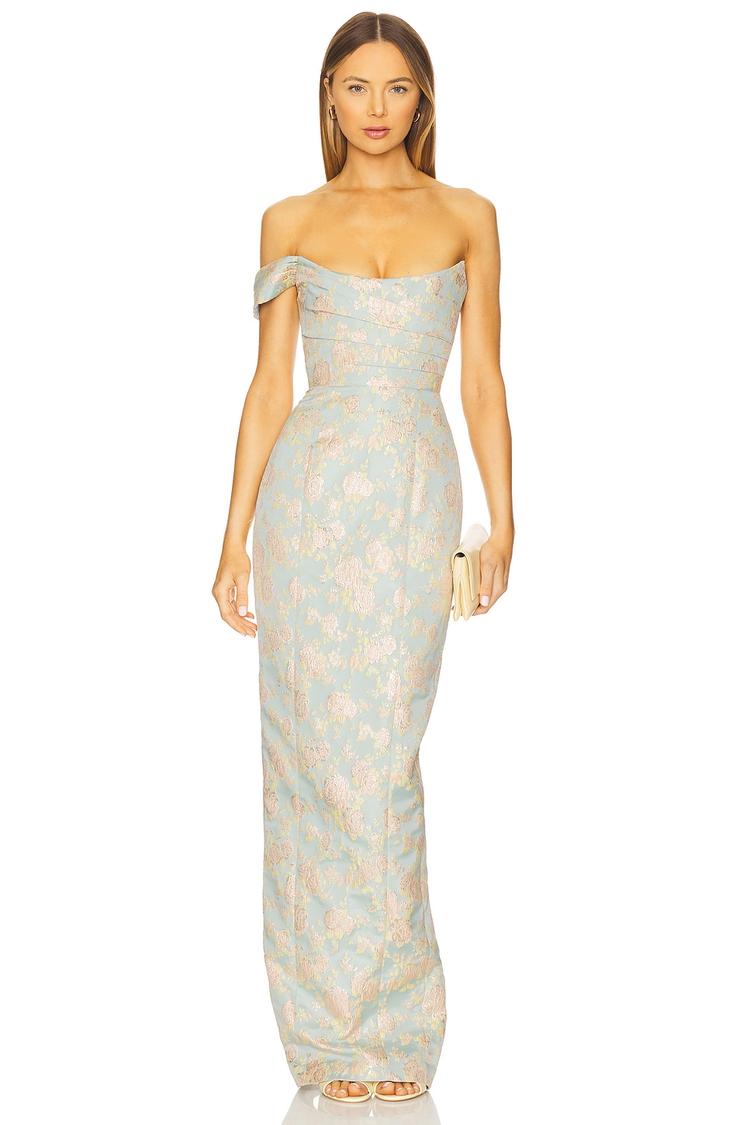 Soft shimmer and delicate metallic floral jacquard define this fitted sheath maxi with a straight neckline and elegant off-shoulder sleeves. The boned bodice and pleated detailing add structured sophistication, while the back slit hem offers graceful movement. Crafted from a midweight polyester blend, this fully lined gown is perfect for cocktail parties, formal events, and wedding guest occasions, blending classic elegance with modern allure.