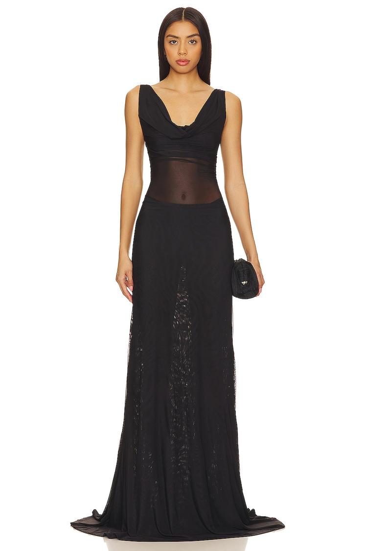 Soft mesh panels and a draped cowl neckline create a sleek and sophisticated silhouette in this black column maxi dress. The fitted bodice and wide straps complement the sheer detailing for an elegant touch, while the pull-on styling ensures comfort. Ideal for cocktail parties, formal events, or a night out, this dress combines minimalist design with subtle sensuality. Crafted from a blend of polyester and spandex, it offers just the right stretch and structure for flattering wear all year round.