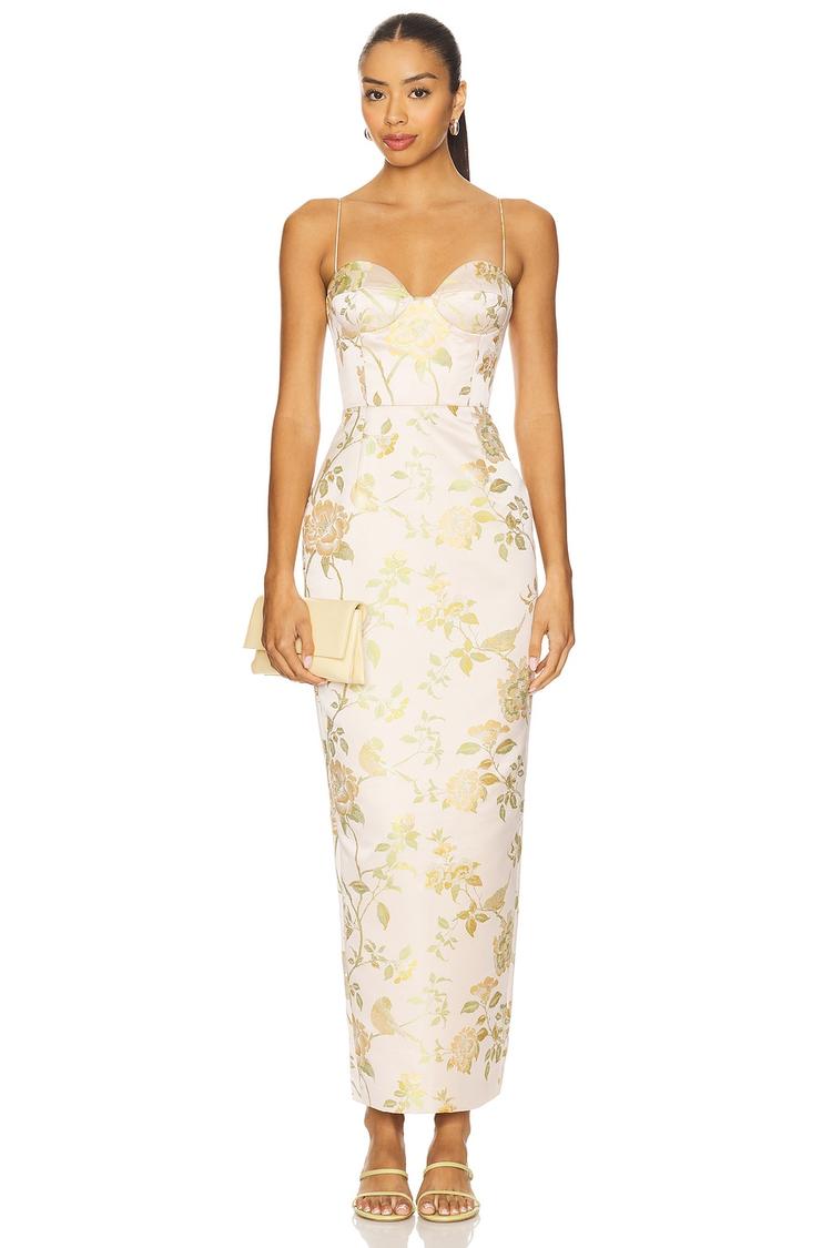 A timeless silhouette in heavyweight floral satin, this fitted sheath dress features a flattering sweetheart neckline and strapless styling for a graceful look. The midi length and back vent add ease to the elegant design, while padded cups and boned sides ensure perfect shaping. Ideal for cocktail parties, formal events, or romantic date nights, this sophisticated dress in matte off-white with delicate beige floral print embodies classic elegance and refined charm.
