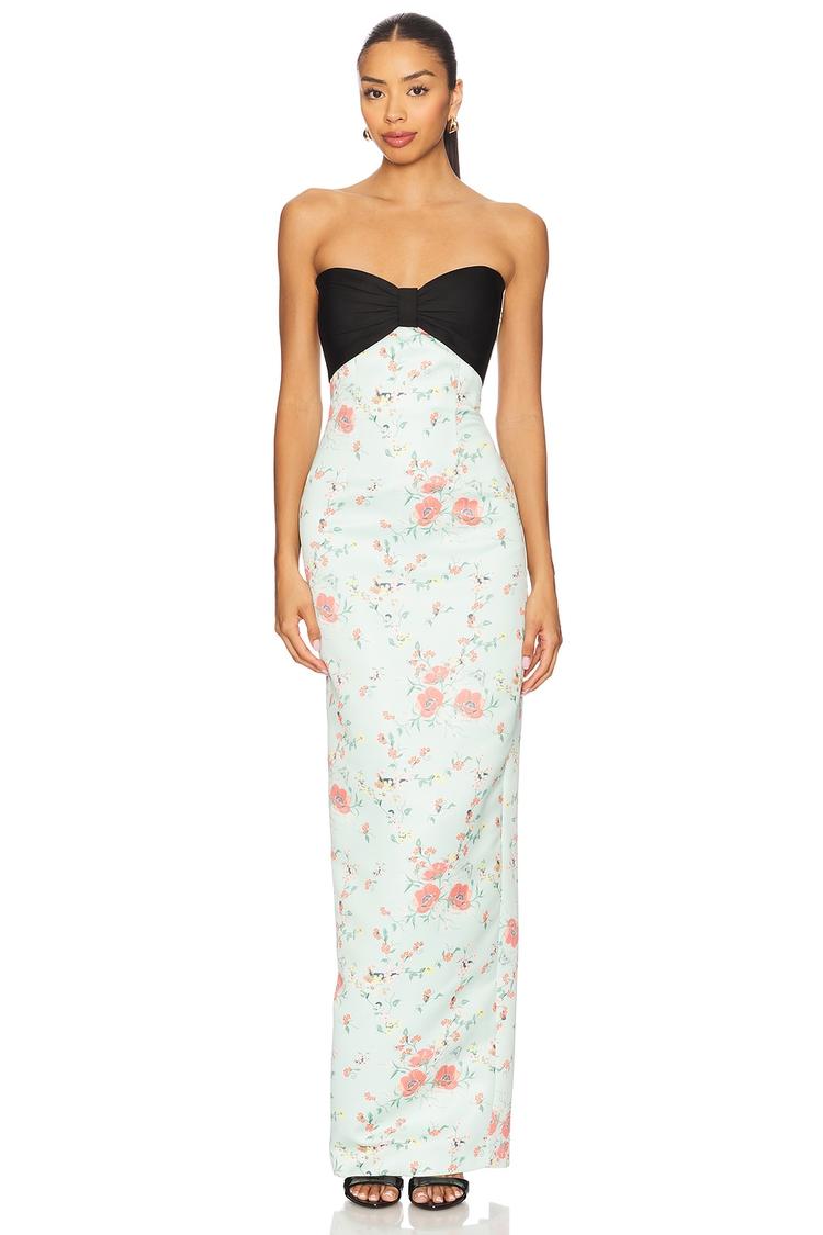 Soft crepe fabric and a figure-hugging column silhouette highlight the sophisticated charm of this strapless maxi dress. The sweetheart neckline and boned bodice with a black bow detail create a flattering bustline, while the subtle floral print in dusty rose and sage adds a delicate touch. Designed with an invisible back zipper and fully lined for comfort, this elegant dress is perfect for cocktail events, date nights, or formal occasions, offering a timeless yet modern look for all seasons.