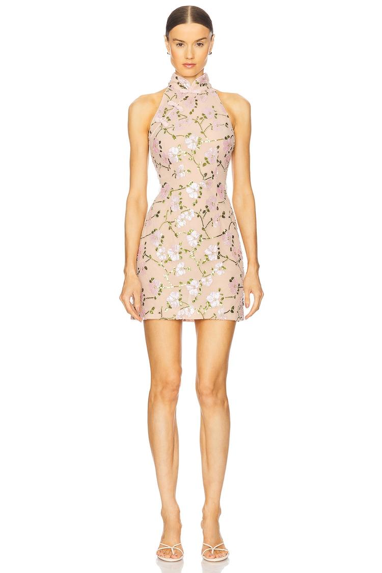 Heavyweight mesh fabric adorned with shimmering floral sequins creates an elegant shift silhouette in a soft blush hue. The mini length pairs beautifully with a chic turtleneck neckline and sleeveless styling, offering a regular fit that balances comfort and sophistication. Invisible back zipper closure ensures seamless wear. This dress shines for cocktail parties, date nights, and evening outings, blending modern chic with delicate sparkle. Fully lined for comfort, the Ora Dress is a standout piece crafted from mesh and silk to elevate your special occasion wardrobe.