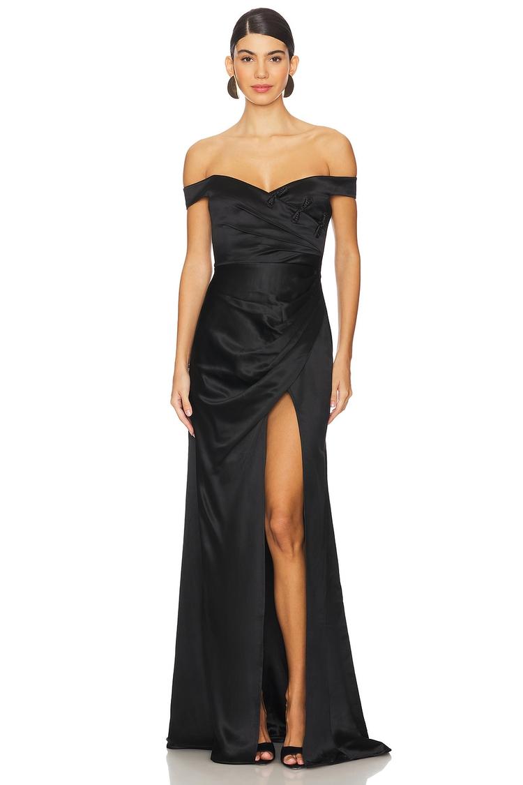 Soft satin fabric drapes gracefully in this elegant column gown, featuring a fitted silhouette and an alluring off-shoulder neckline with wide straps. The floor-length maxi hem with a daring front slit adds a sophisticated edge, perfectly suited for formal occasions, cocktail parties, and gala events. A concealed back zipper and open back design offer a sleek finish, while the smooth texture of satin enhances the gown's classic appeal. This versatile piece combines timeless style with modern allure for memorable evening wear.