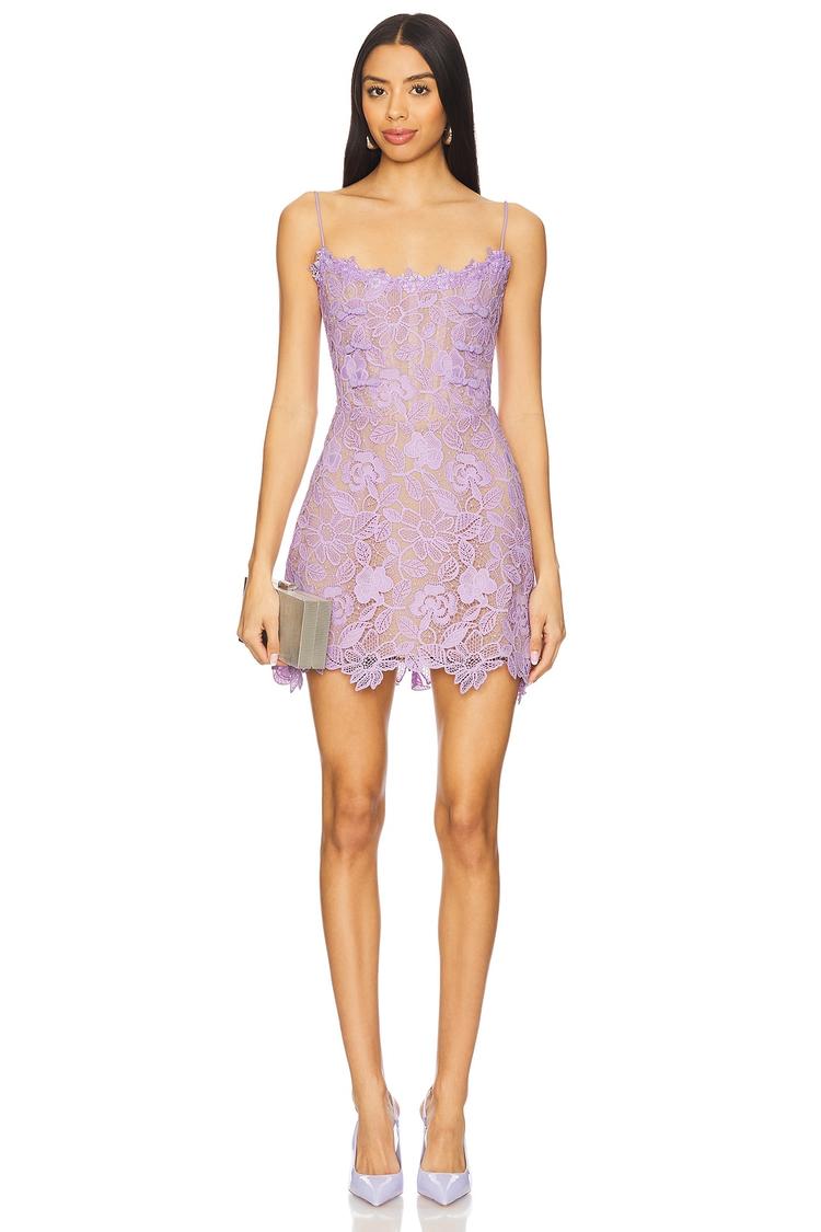 Soft lavender guipure lace forms a fitted sheath silhouette with a strapless straight neckline and scalloped mini hem. The boned bodice enhances the elegant and sexy fit, while a concealed back zipper with hook and eye closure ensures a smooth finish. Fully lined for comfort, this mini dress is perfect for spring and summer cocktail parties, date nights, and evening outings. Its delicate lace texture and structured bodice make it a standout piece for sophisticated occasions.