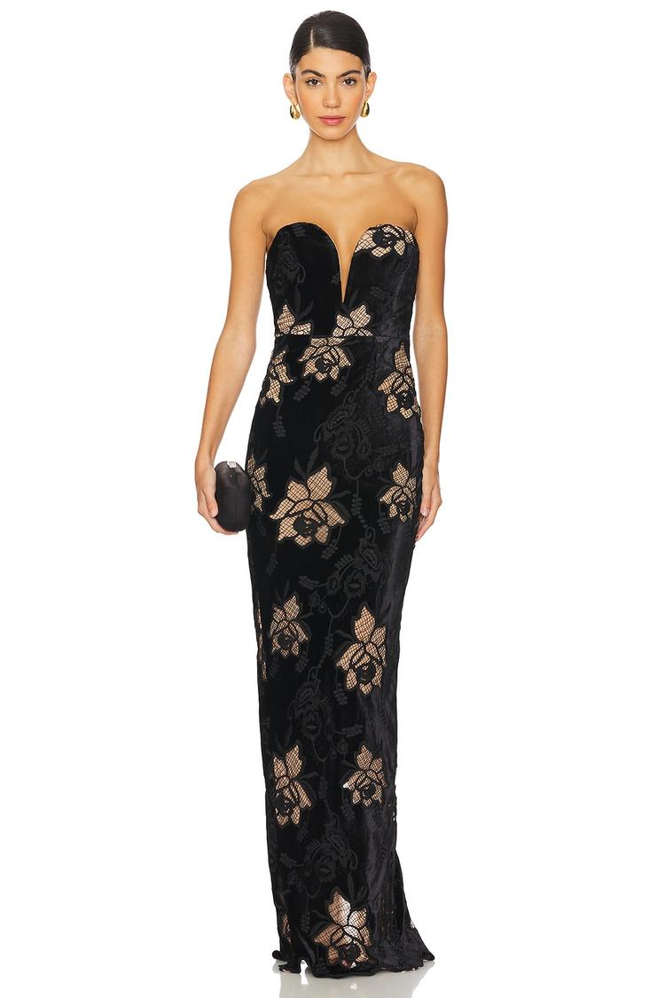 The Viola Gown features a striking column silhouette with a fitted, boned bodice that accentuates the figure elegantly. Crafted from a blend of polyester, lace, and elastane, this strapless maxi gown showcases a dramatic wired plunge neckline and intricate beige applique embroidery over a matte black base. The clean hem and concealed back zipper create a polished finish. Perfect for formal events, cocktail parties, galas, and wedding guest appearances, this sophisticated gown ensures a refined and graceful presence across seasons.