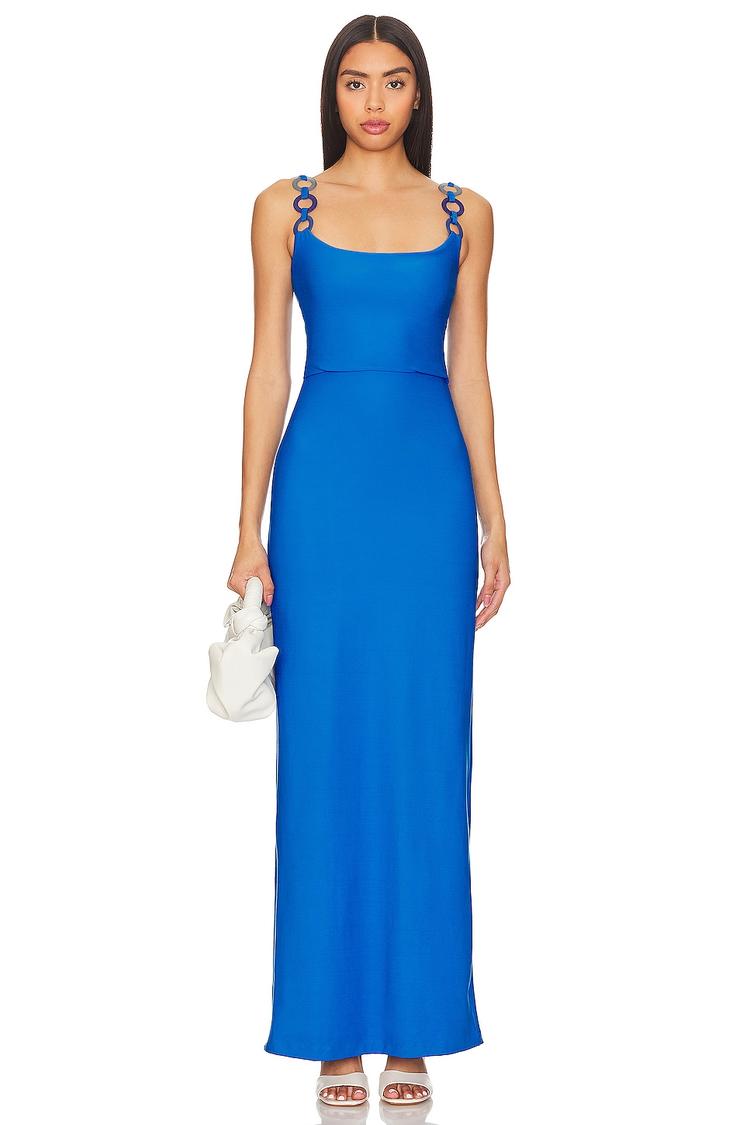A sleek column silhouette in vibrant matte blue jersey fabric offers a fitted, flattering profile. The square neckline and wide straps with acrylic O-ring buckles add a modern edge, while the sleeveless design keeps it fresh for spring and summer evenings. A clean hem and back vent enhance movement and comfort. Ideal for cocktail parties, date nights, or a stylish night out, this pull-on maxi dress combines minimalist elegance with subtle statement details for versatile wear.