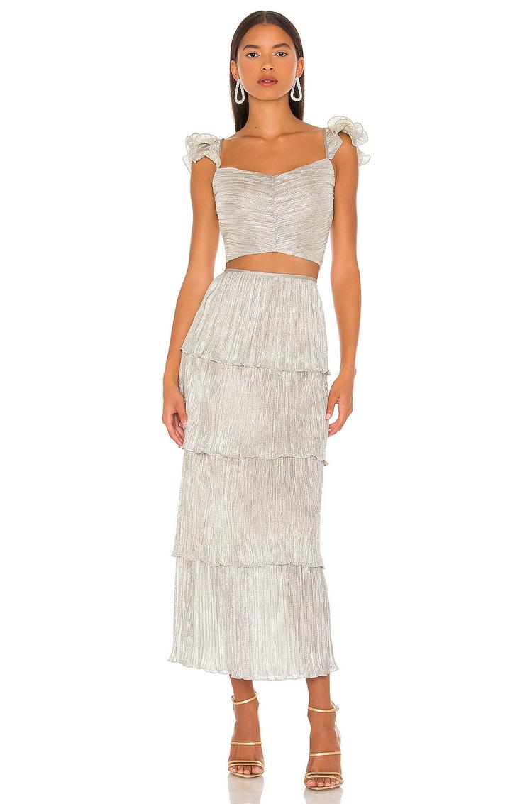 Soft metallic silver fabric with a shimmering finish and a slim fit create a striking two-piece ensemble perfect for spring and summer evenings. The square neckline and ruffled sleeveless shoulders add a romantic touch, while the tiered maxi skirt flows gracefully with delicate ruching at the front. Concealed side zipper closure ensures a sleek silhouette. Ideal for cocktail parties, date nights, and special night outs, this set balances elegance and trendy details with its textured layers and subtle shine.