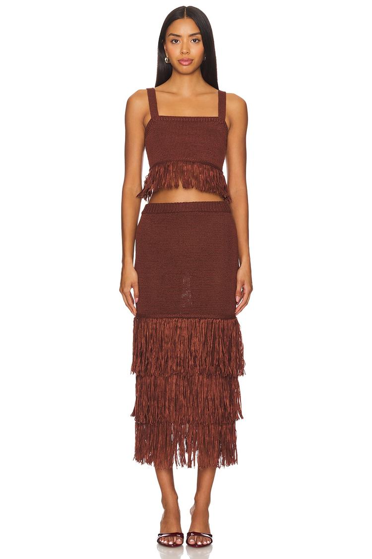 Layered fringe details add dynamic movement to this matte brown two-piece set featuring a slim fit and square neckline with wide straps. The midi-length skirt and matching crop top create a bohemian-inspired silhouette perfect for spring and summer outings. Crafted from lightweight polyester with a pull-on style for easy wear, this trendy ensemble suits brunches, date nights, and lively evenings out. Its covered back and sleeveless design keep the look clean and modern while the layered hemline fringes lend texture and flair.