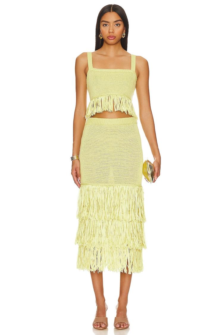 Sunlit spring and summer days call for this fitted two-piece set featuring a square neckline and sleeveless wide straps. Crafted from midweight polyester knit, the ensemble offers comfortable pull-on styling with an elastic waistband. The midi-length skirt and matching top are beautifully accented with fringed hems that add playful movement and bohemian flair. Ideal for casual outings, brunch dates, or relaxed evenings, this set blends casual chic style with easy wearability, making it a versatile addition to your warm-weather wardrobe.
