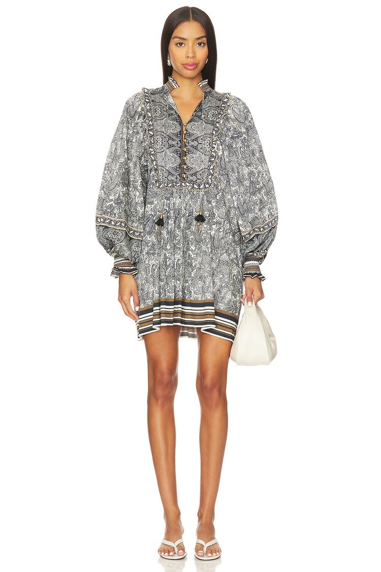 Lightweight voile fabric and a loose, shift silhouette with long blouson sleeves define this mini dress. Its abstract all-over print in muted tones of gray, white, and beige offers a bohemian vibe, enhanced by tassel details at the tie neckline. The clean hem and cinched cuffs add subtle structure to the flowy design. Ideal for casual days, brunches, or relaxed date nights, this breathable dress suits spring and summer wardrobes with effortless style.