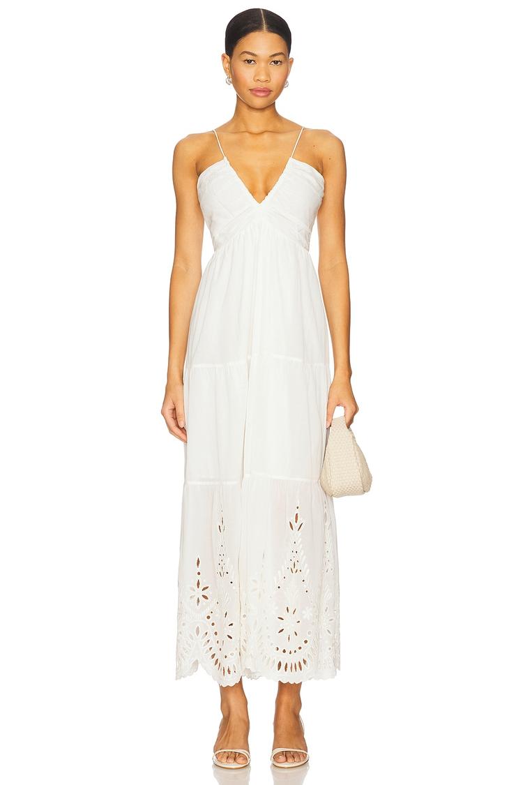 Soft and airy voile fabric blends viscose and cotton for a lightweight feel in this flowy empire waist maxi dress. The V-neckline and sleeveless silhouette with delicate tie-back and keyhole details at the back add romantic charm. Eyelet embroidery and a scalloped hem bring subtle texture and visual interest to the crisp white fabric. Ideal for casual brunches, relaxed vacations, or date nights, this fully lined dress delivers comfort and effortless style in spring and summer seasons.