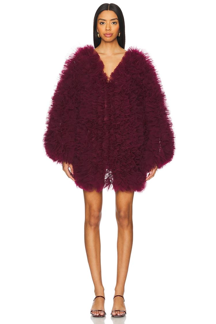Luxurious pleated tulle fabric shapes this babydoll mini dress in a rich matte burgundy hue, offering a lightweight and elegant silhouette. The voluminous balloon sleeves and loose fit create a flattering, fashion-forward look with a deep V-neckline enhancing its chic appeal. Fully lined for comfort, this pull-on style is perfect for cocktail parties, date nights, and vibrant evenings out. Its clean hemline and all-over pleated texture make it a standout piece for those seeking effortless sophistication and trendy charm in their wardrobe.