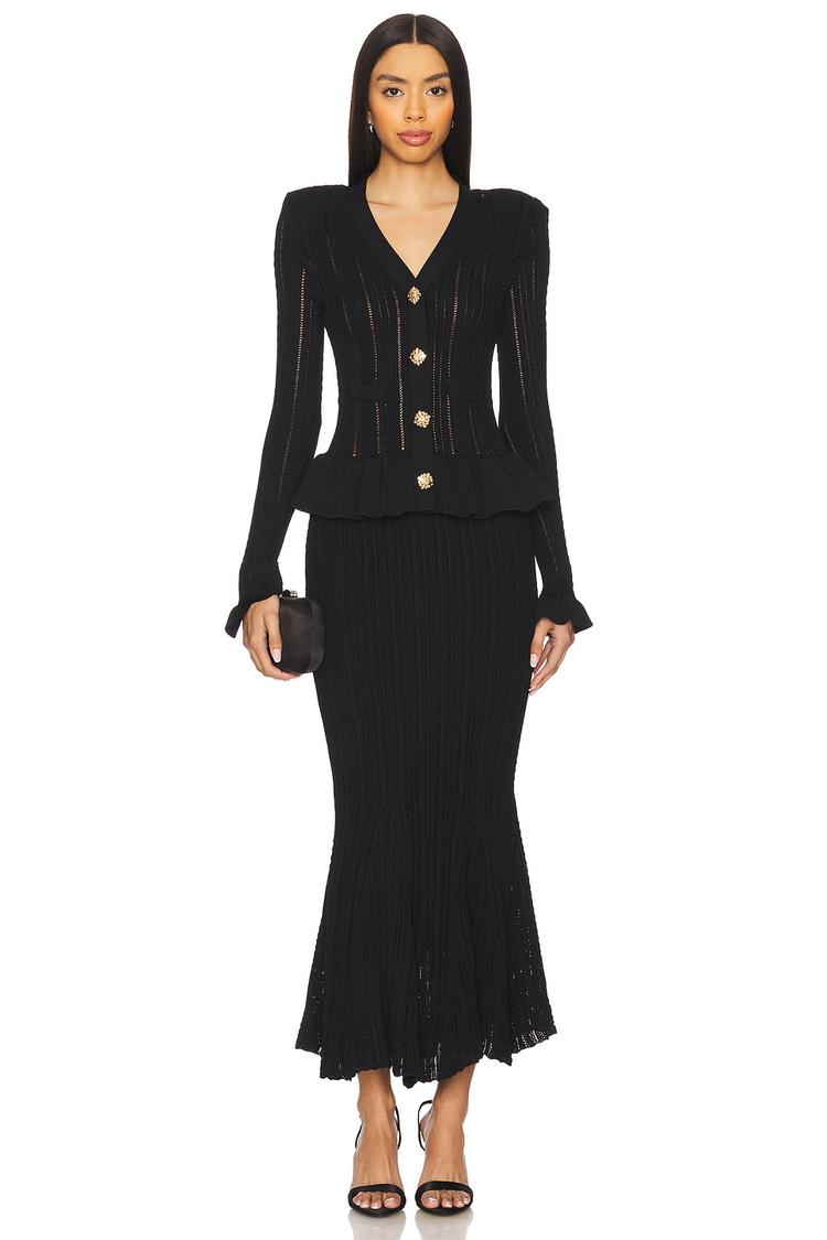 A matte black sheath silhouette defines this polished midi dress, featuring a sharp V-neckline and long regular sleeves for a timeless appeal. The fitted cut accentuates the waist, enhanced by a peplum detail that adds dimension and sophistication. Button closures on the front complement the elegant look, while the ruffled hemline introduces a soft, feminine touch. Crafted from polyester, this dress is perfect for formal events, cocktail parties, and date nights during the cooler autumn and winter seasons. Its sleek design promises to make a lasting impression wherever you go.