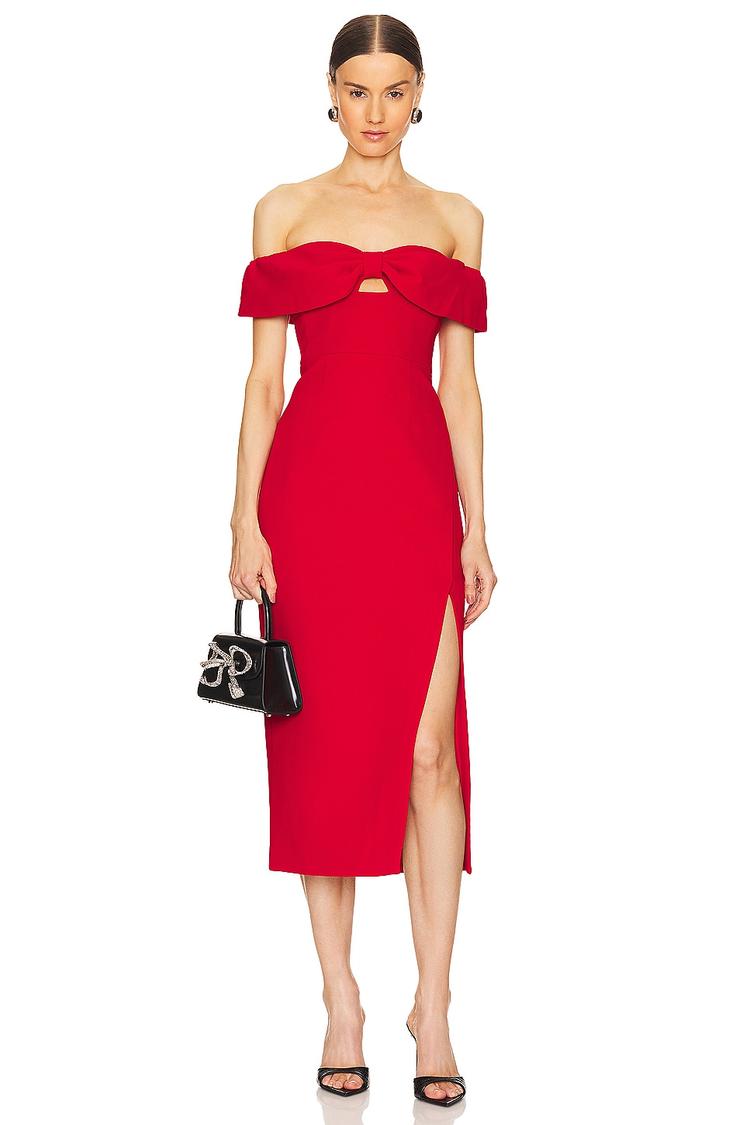 A striking bright red sheath midi dress features an off-shoulder straight neckline with an elegant bow detail and a subtle cut-out at the bust, enhancing its sophisticated silhouette. Crafted from midweight crepe polyester with elastane for a fitted yet comfortable wear, this dress includes a hidden back zipper and a daring side slit hemline. Perfectly suited for spring and summer cocktail parties, date nights, or evening outings, this dress embodies timeless elegance and refined style.