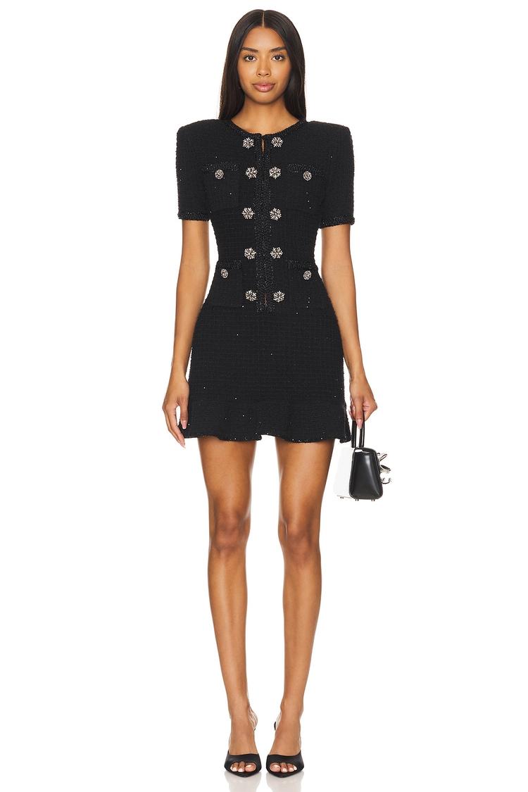 A sleek black knit mini dress features a fitted shift silhouette with a round neckline and short padded sleeves for structured elegance. Sparkling crystal-embellished buttons adorn the front bodice, complemented by practical front pockets and a delicate hook closure. The ruffled hem adds a playful touch, perfect for autumn and winter evenings. Its classic yet chic design makes it ideal for date nights, cocktail parties, brunches, or girls' night outs. This elegant piece effortlessly combines comfort with style in a timeless knit fabric.